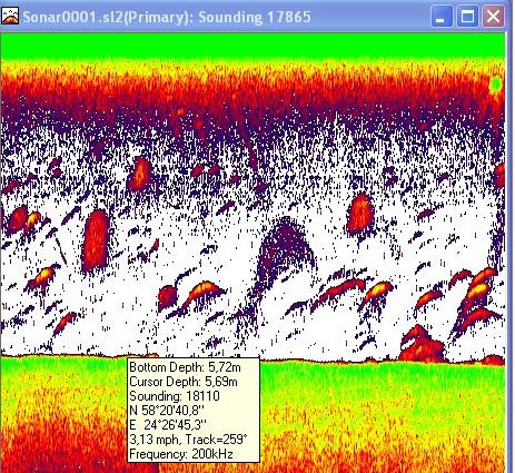 Lisan siia mõned Peipsil tehtud ekraani pildid. Esimesel pildil on trollimise kiirusel näha erinevaid kalu, kollase tuumaga on suuremad. Suuri kalakaari pole, kalad on nägemiskoonuse äärealadel ja/või liiga veepinna ligidal (mäletad, kuidas kalakaar koonuse läbimisel kujuneb!). Keskmisel pildil on aktiivsed ahvenad ankrus paadi all, siis kaari ei teki, on jooned, kuna objektid on paigal anduri suhtes. Kui ahvenad oleks passiivsed, oleks nad täiesti vastu põhja. Siin on oma pool meetrit põhjast kõrgemal. Viimasel pildil on näha, et söök saabus ja ahvenad ründavad pea veepinnani. Söömaaeg on siis paadi all, kalakaari pole, on jutid.